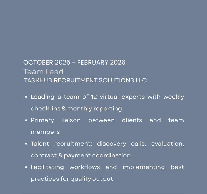 From executive operations and content strategy to team leadership and digital marketing — a versatile skill set built for the modern remote work environment.