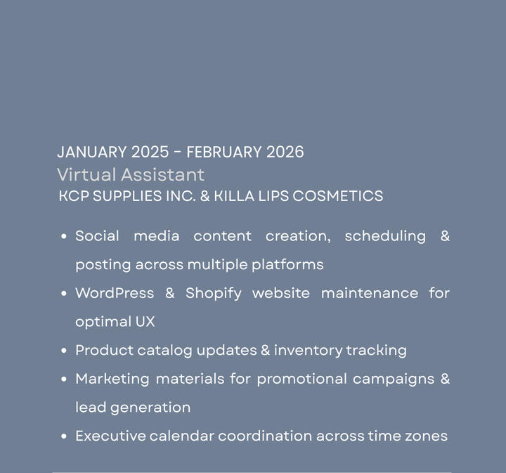 From executive operations and content strategy to team leadership and digital marketing — a versatile skill set built for the modern remote work environment.